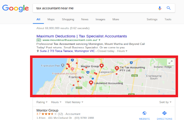 To illustrate how local search works, let’s Google ‘tax accountant near me’. The search engines (mainly Google in this country) will assume